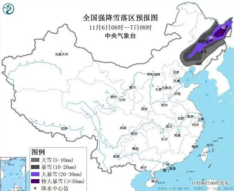 暴雪橙色预警:预计11月6日08时至11月7日08时,内蒙古东南部、黑龙江中东部和南部、吉林大部、辽宁中北部等地部分地区有大到暴雪,其中,内蒙古东南部、黑龙江东北部和南部、吉林中西部等地部分地区有大暴雪,局地特大暴雪(30~40毫米)。上述部分地区新增积雪深度10~20厘米,局地可达30厘米以上。