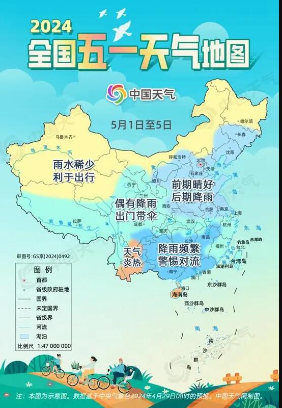中国天气网气象分析师石妍介绍,五一假期前期(5月1日和2日)我国北方大部天气晴好,西部地区有小雨或阵雨天气,江淮、江汉、江南一带雨水也较少,天气情况总体有利于大家出行;假期后期(5月3日至5日),中东部地区有一次大范围降水过程,江南、华南部分地区有中到大雨、局部暴雨;西北地区东部、黄淮、华北及东北地区南部有小到中雨,局地大雨或暴雨,部分地区伴有强对流天气,可能会对假期返程造成影响。